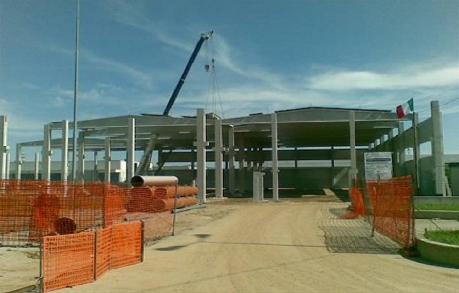 Descrizione lavoro: si tratta di un fabbricato con struttura in c.a.p. con un’altezza sotto trave di 11mt. I pilastri, su plinti di fondazioni gettati in opera, sono dotati di mensole atti a sopportare carri-ponte con portata di 35t; la copertura è a doppia pendenza e copponi. I pannelli di tamponamento sono anch’essi prefabbricati con paramento esterno scolpiti con lesene da fondo cassero e a taglio termico. Il fabbricato destinato a magazzino, ha una minima parte riservata a servizi, spogliatoi e locali tecnici. Per il collegamento con la rete ferroviaria SITO sono stati realizzati due binari a raso, uno interno ed uno esterno nell’area cortiliva, posto ad est del fabbricato.